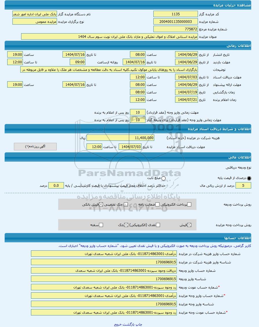 | شماره حساب عودت وجه مزایده | 1700696915 |