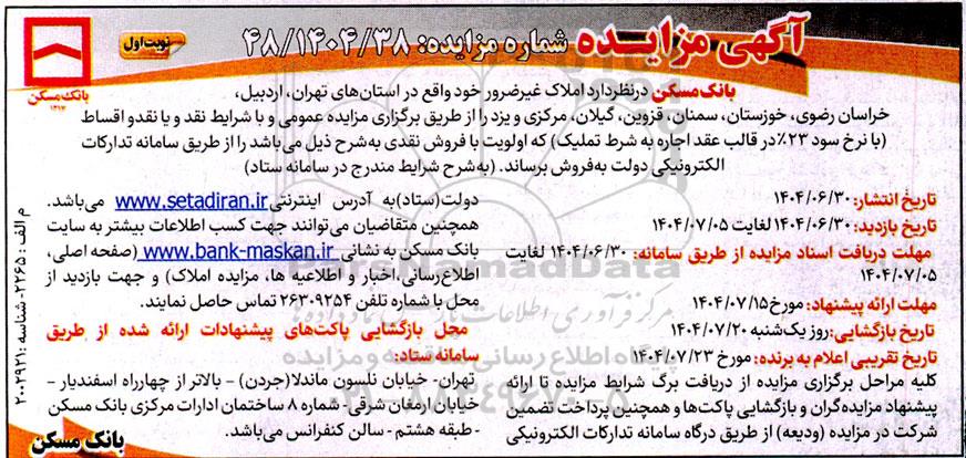 بانک مسکن در نظر دارد املاک غیر ضرور خود واقع در استانهای تهران، اردبیل ،خراسان رضوی ، خوزستان، سمنان، قزوین ،گیلان، مرکزی و یزد را از طریق برگزاری مزایده عمومی و با شرایط نقد و یا نقد و اقساط با نرخ سود 23 %در قالب عقد اجاره به شرط تملیک که اولویت با فروش نقدی به شرح ذیل میباشد را از طریق سامانه تدارکات الکترونیکی دولت به فروش برساند. (به شرح شرایط مندرج در سامانه ستاد)
