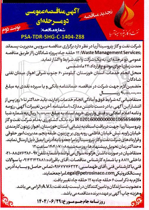 شرکت نفت و گاز پتروسینا آریا در نظر دارد جهت برگزاری مناقصه سرویس مدیریت پسماند Waste ManagementServices 12 حلقه چاه پروژه شادگان را از طریق مناقصه عمومی دو مرحله ای به یک شرکت واجد شرایط واگذار نماید.