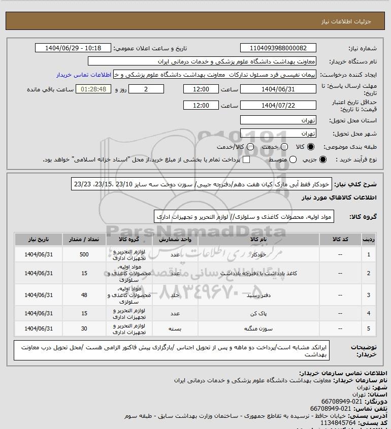 | 1 | -- | خودکار | عدد | لوازم التحریر و تجهیزات اداری | 500 | 1404/06/31 |