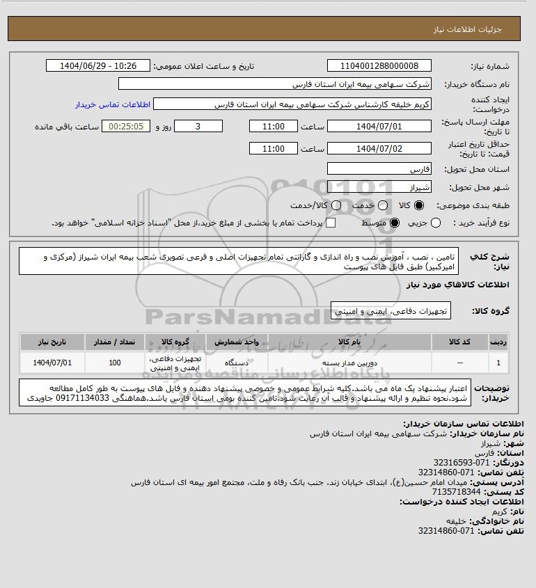 استعلام بها و موضوع استعلام استعلام تامین ، نصب ، آموزش نصب و راه اندازی و گارانتی تمام تجهیزات اصلی و فرعی تصویری شعب بیمه ایران شیراز (مرکزی و امیرکبیر) طبق فایل های پیوست به اطلاع کلیه شرکتها و افراد متخصص واجد شرایط میرساند، آگهی گذار در نظر دارد از طریق استعلام بها، نسبت به انتخاب و دریافت پیشنهادات اقدام نماید. این استعلام با کد آگهی ثبت شده در سامانه خبرگزاری پارس نماد : 9571306 منتشر شده است. مشخصات استعلام : تاریخ شروع استعلام: 1404/06/29 آخرین مهلت ارسال پیشنهاد قیمت : 1404/07/01 و محل اجرای پروژه : استان فارس میباشد. استعلام قیمت مورد درخواست : استعلام تامین ، نصب ، آموزش نصب و راه اندازی و گارانتی تمام تجهیزات اصلی و فرعی تصویری شعب بیمه ایران شیراز (مرکزی و امیرکبیر) طبق فایل های پیوست با دستهبندیهای تخصصی و گروه های مرتبط : سیستم های حفاظتی-دوربین مدار بسته،دزدگیر،آیفون تصویری و آنتن مرکزی, استعلام اطلاع رسانی میگردد.
