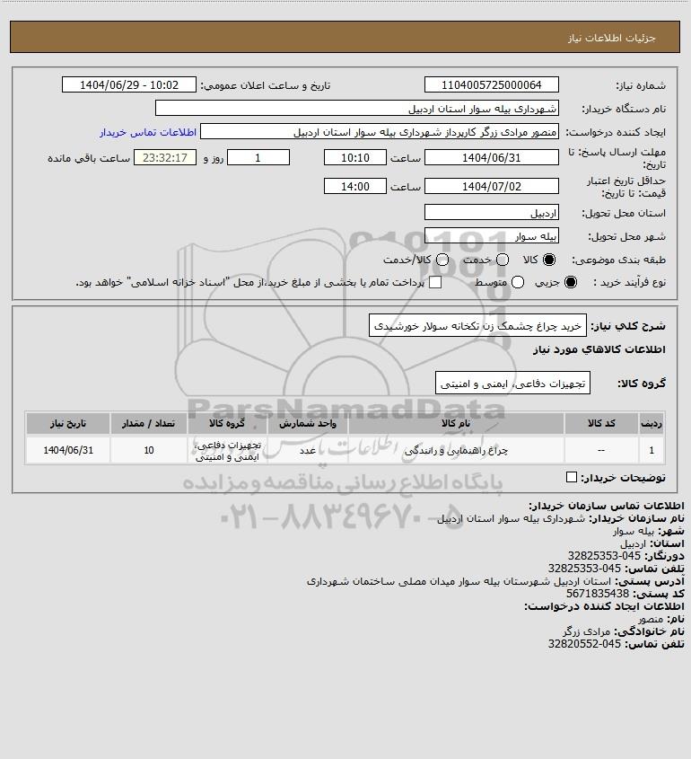 | 1 | -- | چراغ راهنمایی و رانندگی | عدد | تجهیزات دفاعی، ایمنی و امنیتی | 10 | 1404/06/31 |