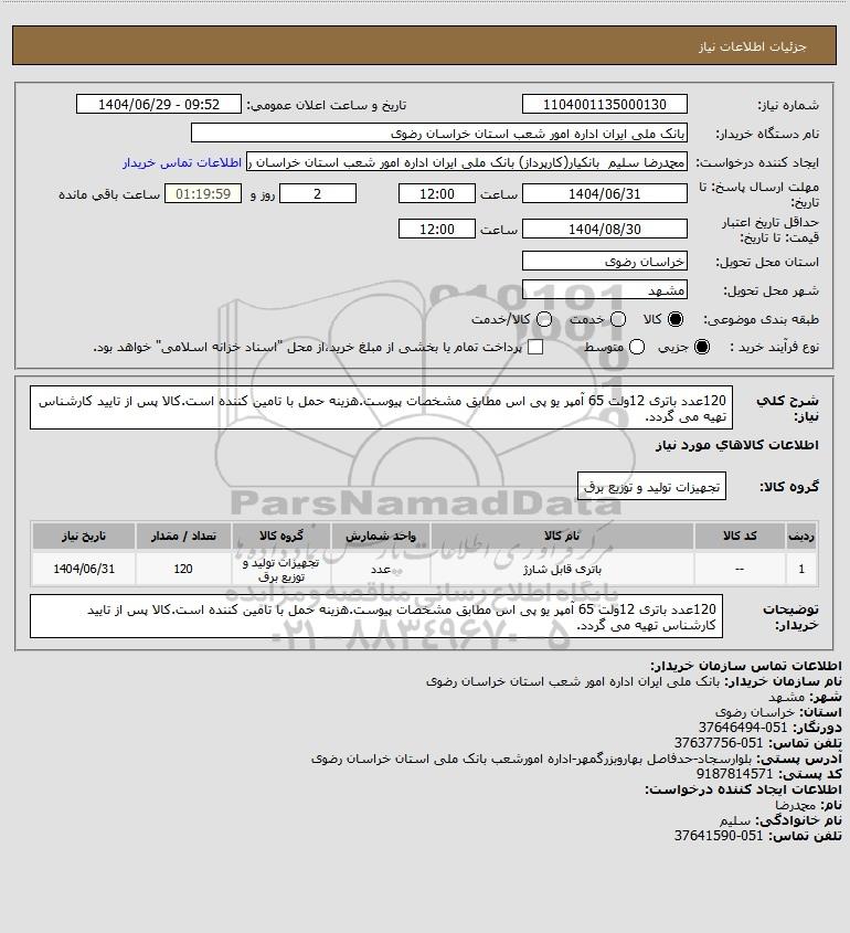 | 1 | -- | باتری قابل شارژ | عدد | تجهیزات تولید و توزیع برق | 120 | 1404/06/31 |