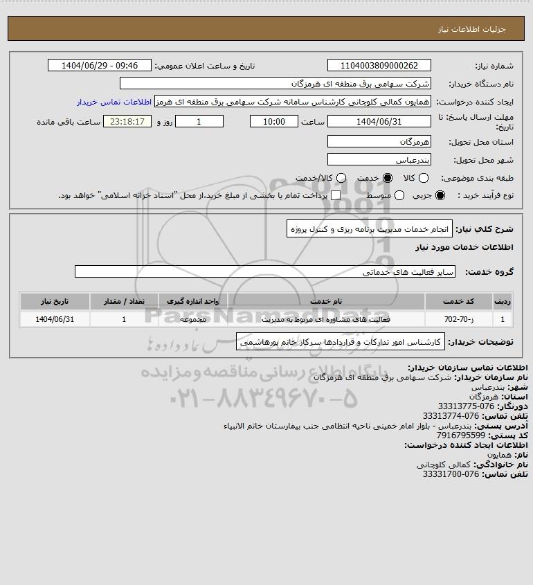 نام سازمان خریدار: شرکت سهامی برق منطقه ای هرمزگان