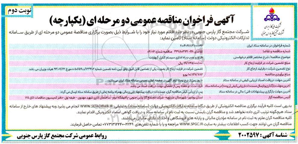 شرکت مجتمع گاز پارس جنوبی در نظر دارد اقلام مورد نیاز خود را با شرایط ذیل بصورت برگزاری مناقصه عمومی دو مرحله ای از طریق سامانه تدارکات الکترونیکی دولت (سامانه ستاد) تامین نماید: