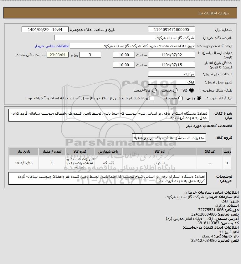 | 1 | -- | اسکرابر | دستگاه | تجهیزات شستشو، نظافت، پاکسازی و تصفیه | 1 | 1404/07/15 |
