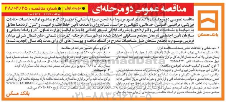 مناقصه عمومی دو مرحله ای واگذاری امور مربوط به تامین نیروی انسانی و تجهیزات لازم به منظور ارائه خدمات حفاظت فیزیکی، مراقبتی، امنیتی، خدماتی، نگهبانی و حراست شبانه روزی با هدف تامین حفظ نظم و امنیت و کنترل ترددها مطابق با ضوابط و مشخصات فنی و قراردادی و مقررات ابلاغی نیروی انتظامی (ناجا) و قوانین وزارت تعاون، کار و رفاه اجتماعی و سازمان تأمین اجتماعی در محل مجتمع مسکونی احداث شده در شهرستان قرچک، کمربندی شمالی، ضلع شمال شرقی میدان فردیس موسوم به مجتمع سبحان طبق مشخصات مندرج در اسناد مناقصه و پیوستهای آن برای مدت یک سال (تجدید شده)