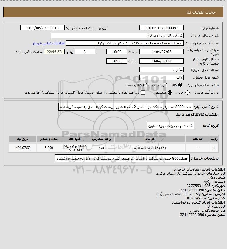 شرح کلی نیاز: تعداد8000 عدد زانو ساکت بر اساس 2 صفحه شرح پیوست کرایه حمل به عهده فروشنده