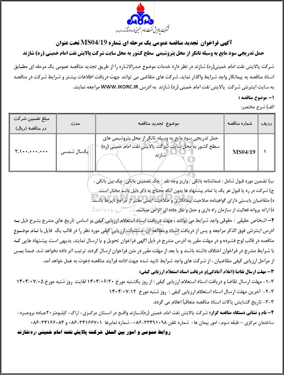 1  MS04/19 حمل تدریجی سود مایع به وسیله تانکر از محل پتروشیمی های سطح کشور به محل سایت شرکت پالایش نفت امام خمینی (ره) شازند یکسال شمسی 2.100.000.000