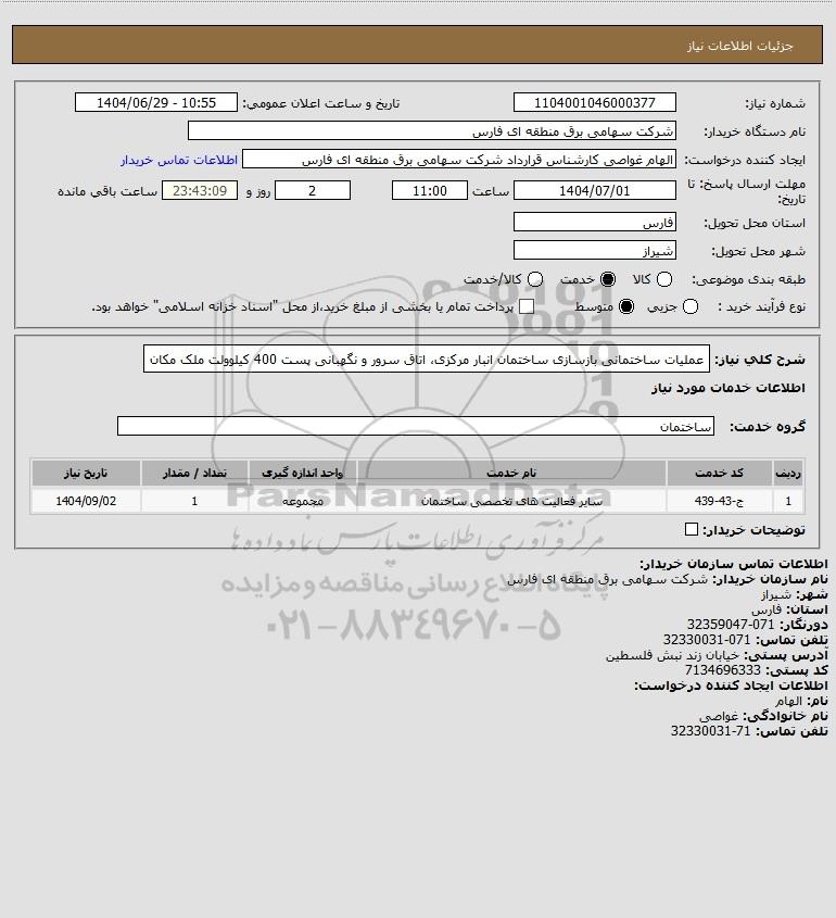 شرح کلی نیاز: عملیات ساختمانی بازسازی ساختمان انبار مرکزی، اتاق سرور و نگهبانی پست 400 کیلوولت ملک مکان