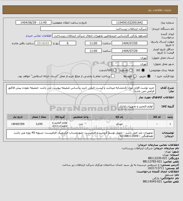 شرح کلی نیاز: خرید نوشت افزار- ایران کدمشابه میباشد و لیست اصلی خرید براساس ضمیمه پیوست می باشد -ضمیمه نمودن پیش فاکتور الزامی می باشد