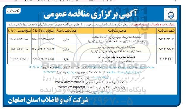 | 404-3-249.2 | عملیات مدیریت بهره برداری آب ، فاضلاب و خدمات مشترکین منطقه نطنز با ارزیابی کیفی | جاری | 150.717.350.898 | 5.091.520.000 |