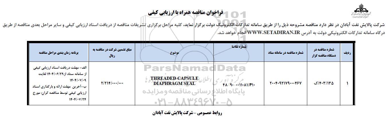 | 1 | ک.403.135 | 2004092179000467 | 48-90-001081/P10 | THREADED CAPSULE DIAPHRAGM SEAL | 2.214.000.000 | الف : مهلت دریافت اسناد ارزیابی کیفی از سامانه ستاد 1404.6.29 لغایت 1404.9.7 ب: آخرین مهلت ارائه و بارگذاری اسناد ارزیابی کیفی توسط مناقصه گران مورخ 1404.7.24 |