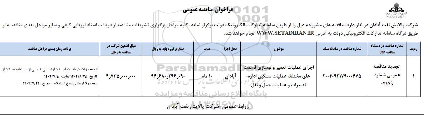 | 1 | تجدید مناقصه شماره 04/59 | 2004092179000475 | اجرای عملیات تعمیر و نوسازی قسمت های مختلف عملیات سنگین اداره تعمیرات و عملیات حمل و نقل | آبادان | 10 ماه | 94.680.296.090 | 4.735.000.000 | الف- مهلت دریافت اسناد ارزیابی کیفی از سامانه ستاد از تاریخ 1404.6.25 لغایت 1404.7.5 ب- مهلت ارسال پاسخ استعلام: مورخ 1404.7.21 |