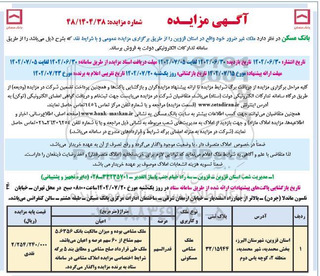بانک مسکن در نظر دارد ملک غیر ضرور خود واقع در استان قزوین را از طریق برگزاری مزایده عمومی و با شرایط نقد که بشرح ذیل می باشد را از طریق سامانه تدارکات الکترونیکی دولت به فروش برساند.