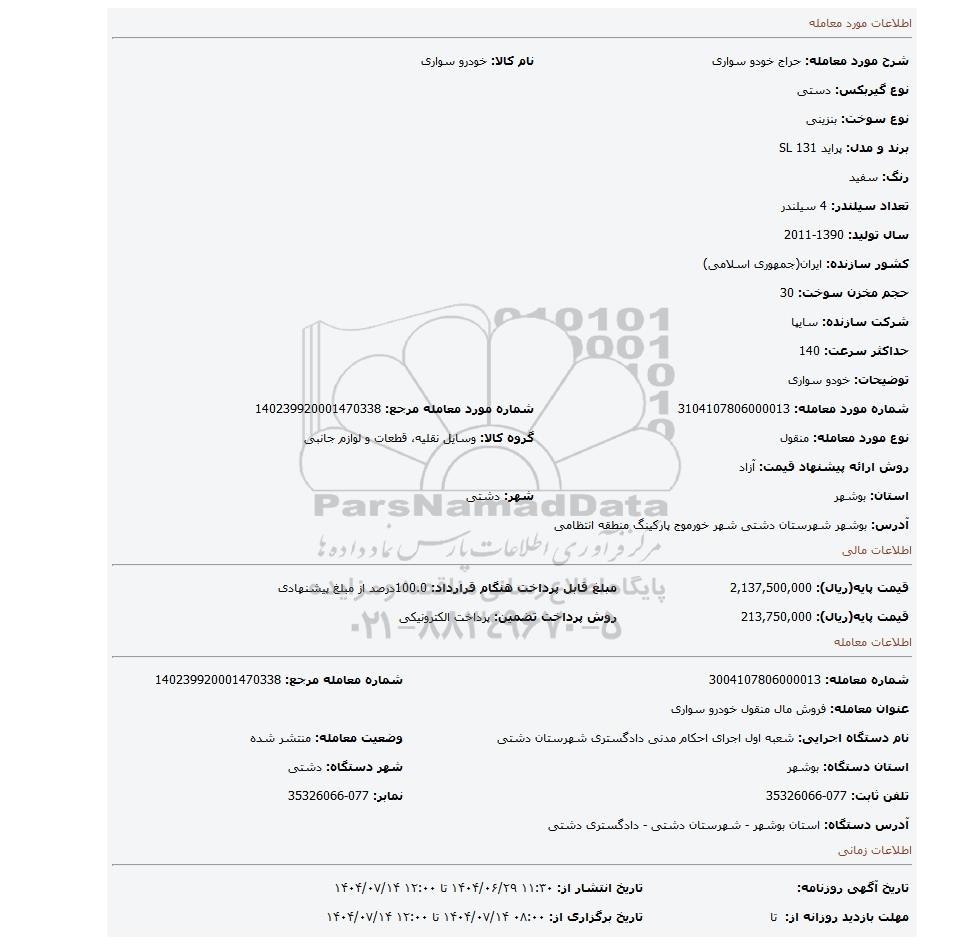14 مزایده خودرو 9810321 1404/08/15 new not special not payed تهران