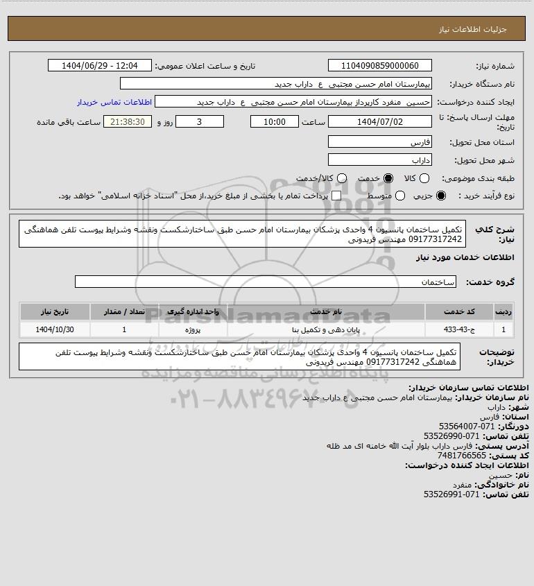 شرح کلی نیاز: تکمیل ساختمان پانسیون 4 واحدی پزشکان بیمارستان امام حسن طبق ساختارشکست ونقشه وشرایط پیوست تلفن هماهنگی 09177317242 مهندس فریدونی