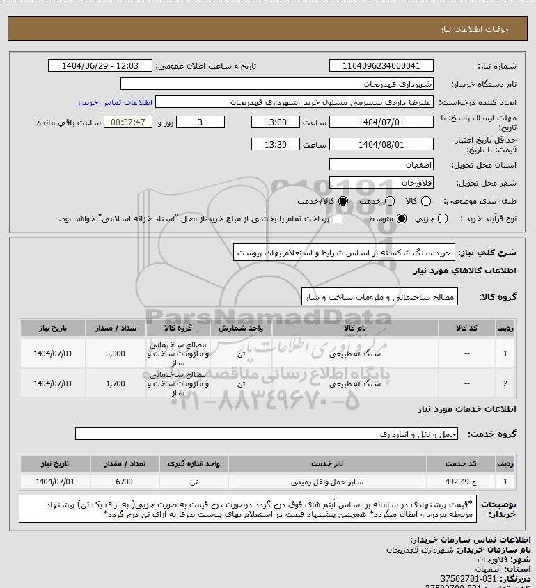 شرح کلی نیاز: خرید سنگ شکسته بر اساس شرایط و استعلام بهای پیوست