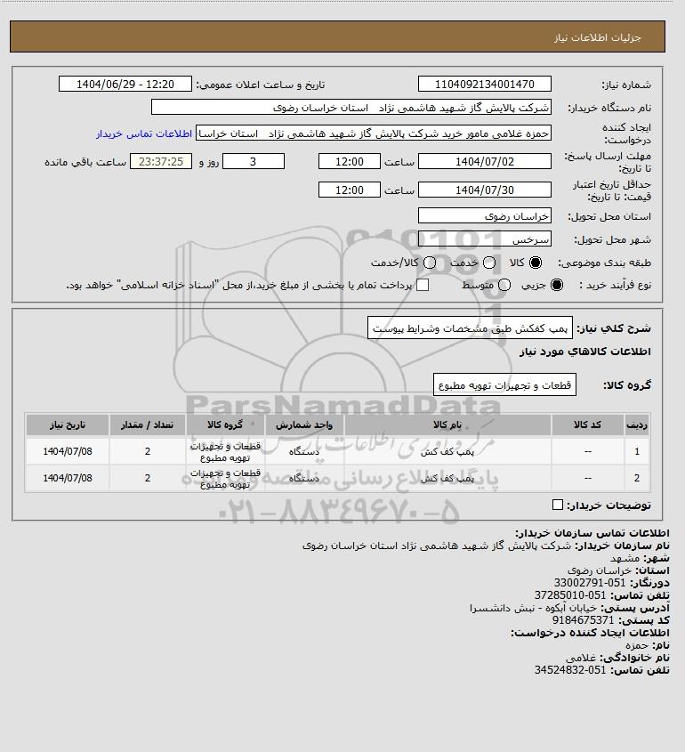 شرح کلی نیاز: پمپ کفکش طبق مشخصات وشرایط پیوست