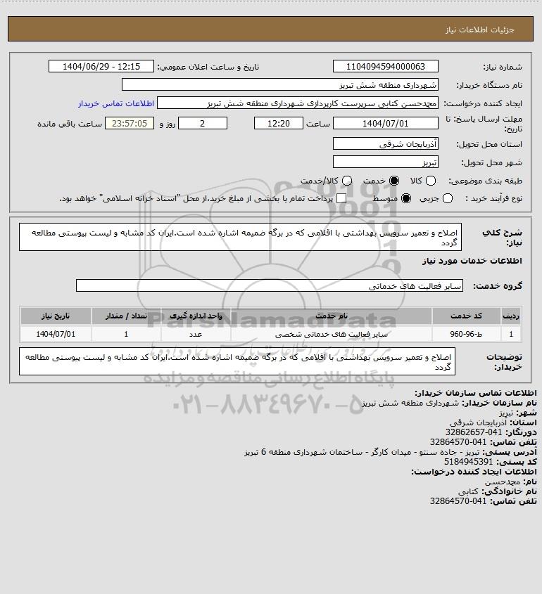 شرح کلی نیاز: اصلاح و تعمیر سرویس بهداشتی با اقلامی که در برگه ضمیمه اشاره شده است.ایران کد مشابه و لیست پیوستی مطالعه گردد
