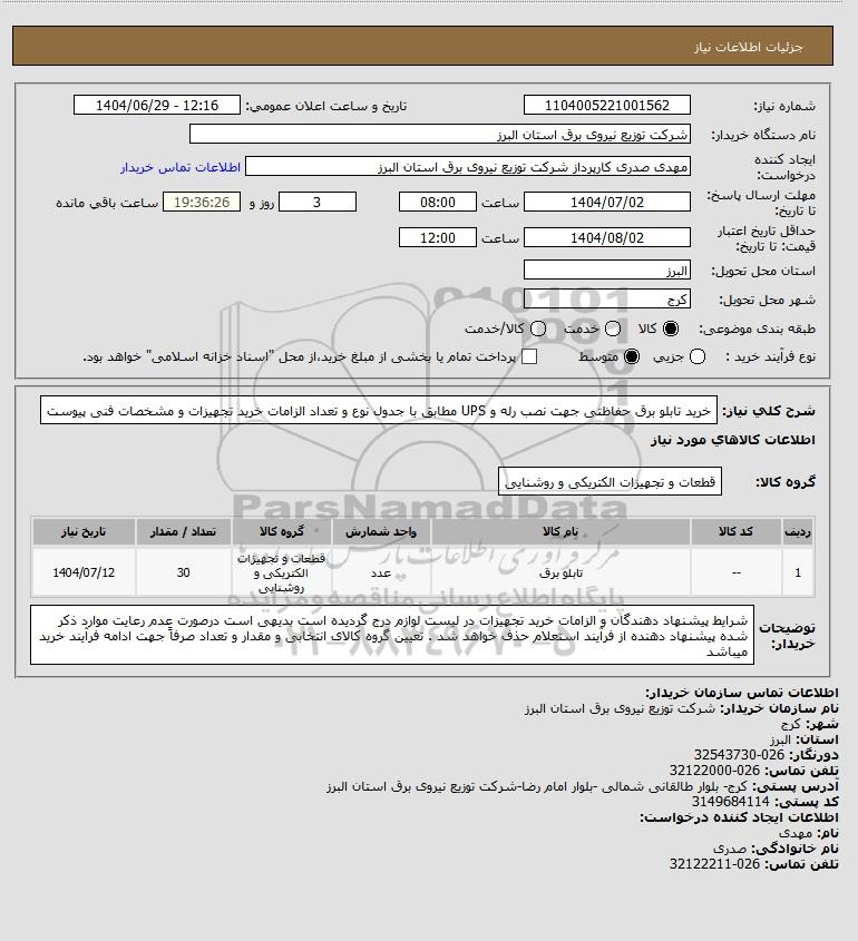 | 1 | -- | تابلو برق | عدد | قطعات و تجهیزات الکتریکی و روشنایی | 30 | 1404/07/12 |