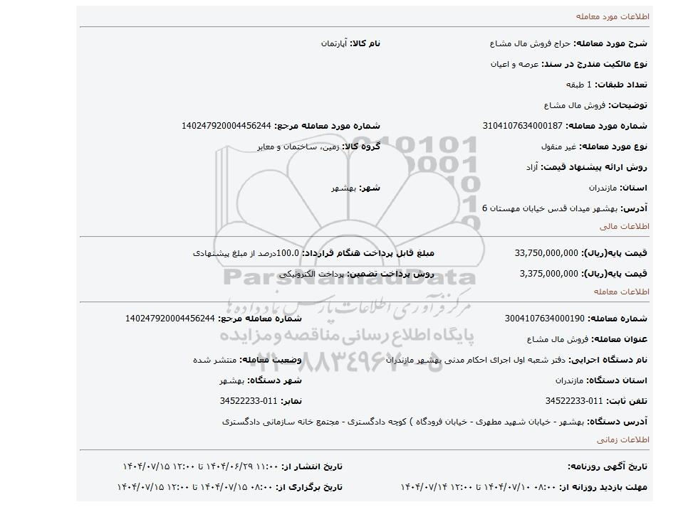 | شرح مورد معامله: حراج فروش مال مشاع | نام کالا: آپارتمان | |