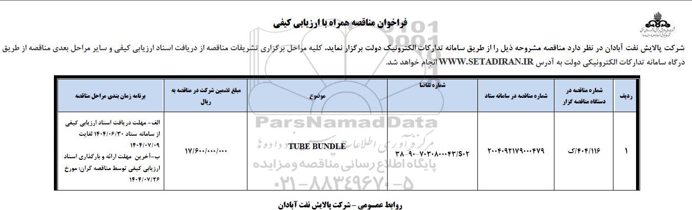فراخوان ارزیابی کیفی مناقصه TUBE BUNDLE از کلیه افراد متخصص و شرکتها واجد شرایط دعوت به عمل میآید در مناقصه با کد خبرگزاری پارس نماد: 9572762 شرکت نمایند.