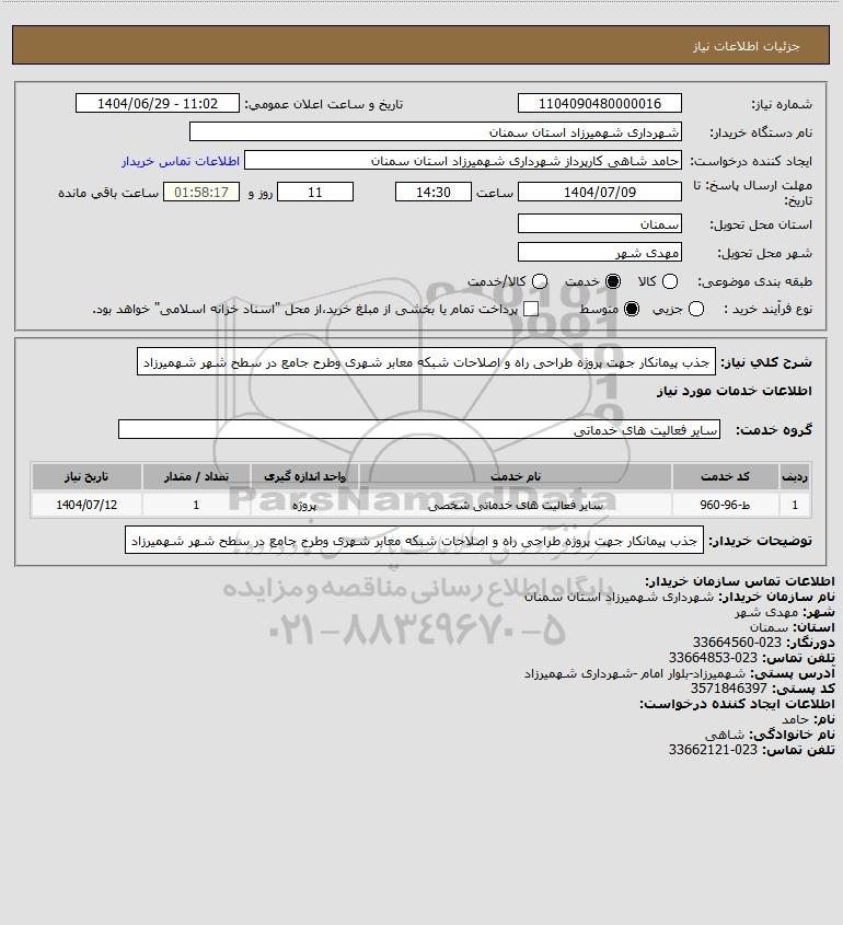 شرح کلی نیاز: جذب پیمانکار جهت پروژه طراحی راه و اصلاحات شبکه معابر شهری وطرح جامع در سطح شهر شهمیرزاد