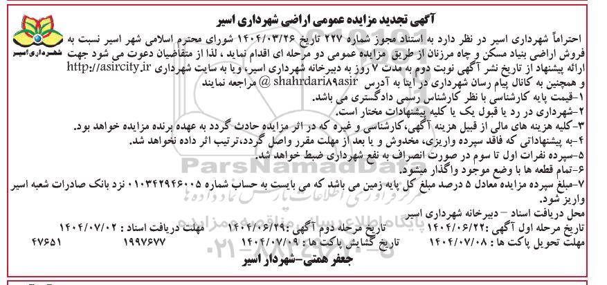 احتراماً شهرداری اسیر در نظر دارد به استناد مجوز شماره 227 تاریخ 1404.03.26 شورای محترم اسلامی شهر اسیر نسبت به فروش اراضی بنیاد مسکن و چاه مرزنان از طریق مزایده عمومی دو مرحله ای اقدام نماید ، لذا از متقاضیان دعوت می شود جهت ارائه پیشنهاد از تاریخ نشر آگهی نوبت دوم به مدت 7 روز به دبیرخانه شهرداری اسیر و یا به سایت شهرداری http://asircity.ir و همچنین به کانال پیام رسان شهرداری در ایتا به آدرس shahrdari89asir @ مراجعه نمایند