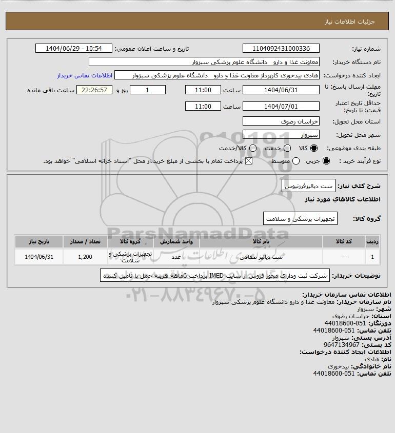 | 1 | -- | ست دیالیز صفاقی | عدد | تجهیزات پزشکی و سلامت | 1,200 | 1404/06/31 |