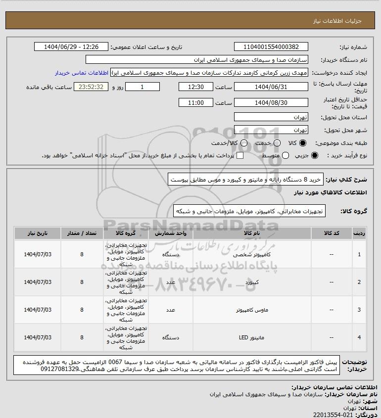 | 1 | -- | کامپیوتر شخصی | دستگاه | تجهیزات مخابراتی، کامپیوتر، موبایل، ملزومات جانبی و شبکه | 8 | 1404/07/03 |