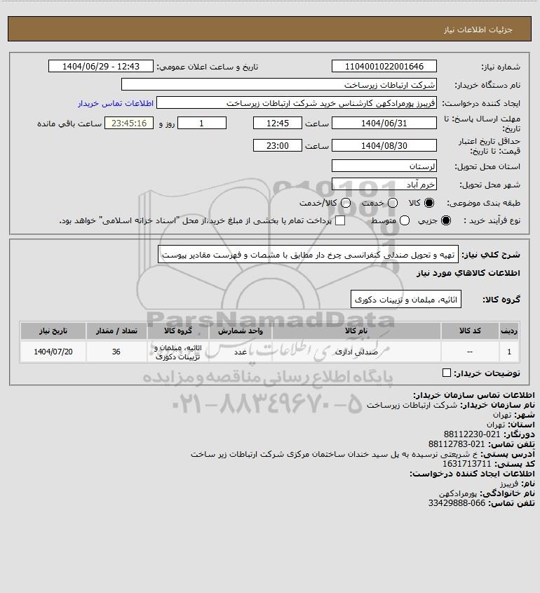 | 1 | -- | صندلی اداری | عدد | اثاثیه، مبلمان و تزیینات دکوری | 36 | 1404/07/20 |