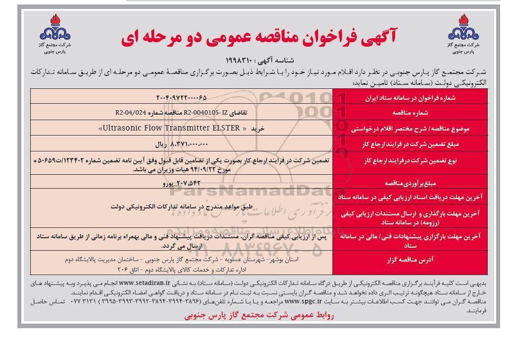 شرکت مجتمع گاز پارس جنوبی در نظر دارد اقلام مورد نیاز خود را با شرایط ذیل بصورت برگزاری مناقصه عمومی دو مرحله ای از طریق سامانه تدارکات الکترونیکی دولت (سامانه ستاد) تامین نماید.