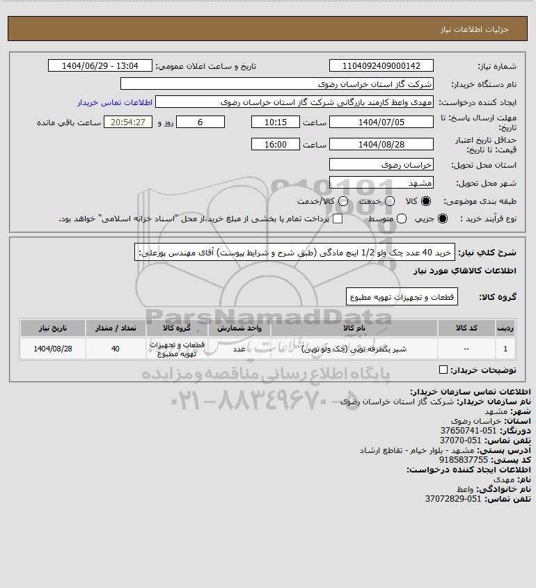 شرح کلی نیاز: خرید 40 عدد چک ولو 1/2 اینچ مادگی (طبق شرح و شرایط پیوست) آقای مهندس پورعلی: