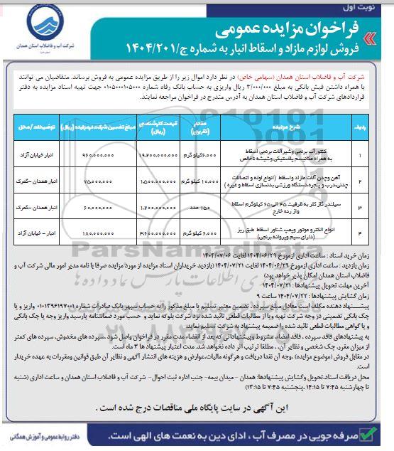 شرکت آب و فاضلاب استان همدان (سهامی خاص) در نظر دارد اموال زیر را از طریق مزایده عمومی به فروش برساند. متقاضیان می توانند. با همراه داشتن فیش بانکی به مبلغ 3.000.000 ریال واریزی به حساب بانک رفاه شماره 0105000105000 جهت تهیه استاد مزایده به دفتر قراردادهای شرکت آب و فاضلاب استان همدان به آدرس مندرج در فراخوان مراجعه نمایند.