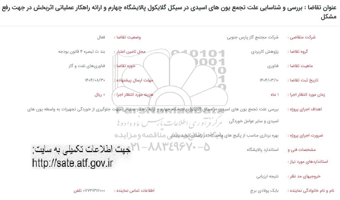 علاقهمندان میتوانند جهت دریافت اسناد و اطلاعات تکمیلی، فراخوان بررسی و شناسایی علت تجمع یون های اسیدی در سیکل گلایکول با سامانه مناقصات و مزایدات ایران پارسنماد داده ها 88349670 تماس حاصل نمایند.