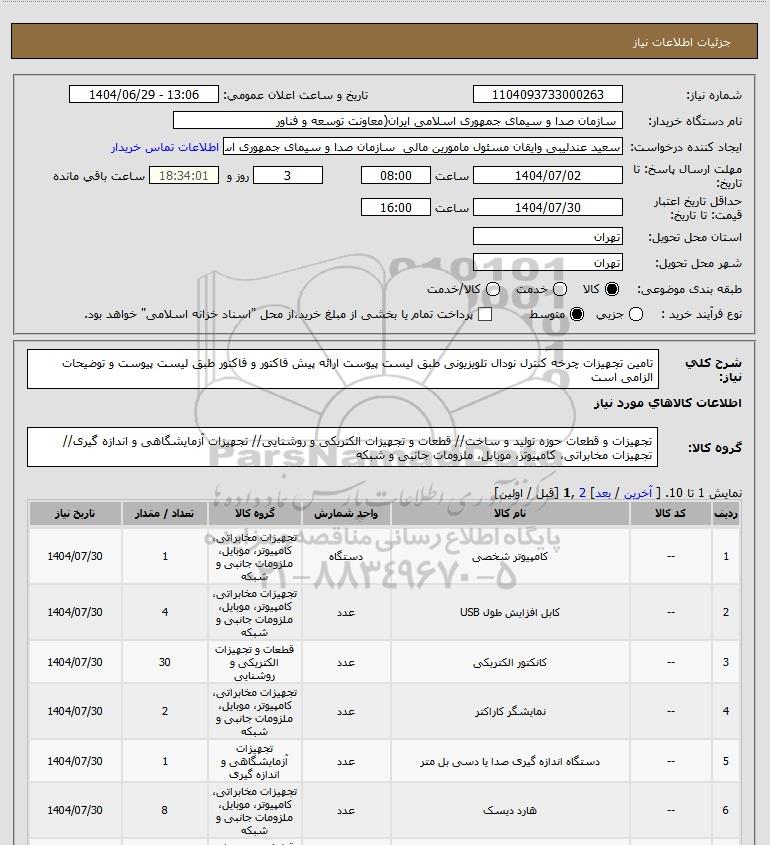 شرح کلی نیاز: تامین تجهیزات چرخه کنترل نودال تلویزیونی طبق لیست پیوست