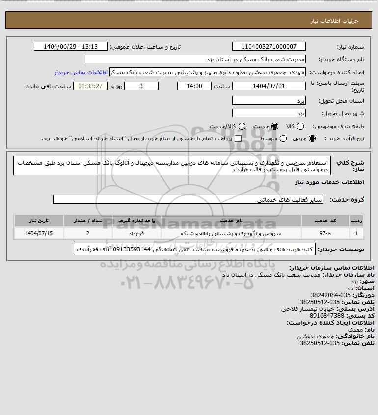 نام دستگاه خریدار:مدیریت شعب بانک مسکن در استان یزد