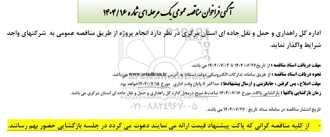 اداره کل راهداری و حمل و نقل جاده ای استان مرکزی در نظر دارد انجام پروژه از طریق مناقصه عمومی به شرکتهای واجد شرایط واگذار نماید.