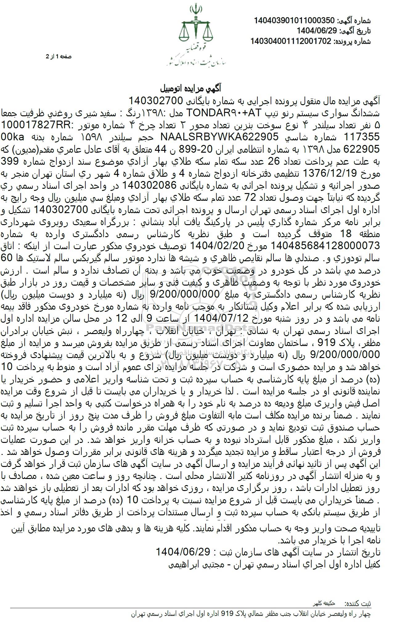 ششدانگ سواری سیستم رنو تیپ TONDARAT مدل : 1398 رنگ : سفید شیری روغني ظرفيت جمعا5 نفر تعداد سیلندر 4 نوع سوخت بنزین تعداد محور 2 تعداد چرخ 4 شماره موتور : 100017827 117355 شماره شاسي NAALSRBYWKA622905 حجم سیلندر 1598 شماره بدنه Ooka 622905 مدل 1398 به شماره انتظامی ایران 20-899 ن 44 متعلق به آقای عادل عامری مقدم (مدیون) که به علت عدم پرداخت تعداد 26 عدد سکه تمام سکه طلاي بهار آزادي موضوع سند ازدواج شماره 399 مورخ 1376/12/19 تنظیمی دفترخانه ازدواج شماره 4 و طلاق شماره 4 شهر ري استان تهران منجر به صدور اجرائیه و تشکیل پرونده اجرائی به شماره بایگانی 140302086 در واحد اجرای اسناد رسمي ري گردیده که نیابتا جهت وصول تعداد 72 عدد تمام سکه طلاي بهار آزادي و مبلغ سي ميليون ريال وجه رایج به اداره اول اجرای اسناد رسمی تهران ارسال و پرونده اجرائی تحت شماره بایگانی 140302700 تشکیل و برابر نامه مرکز شماره گذاری پلیس در پارکینگ یافت آباد بنشاني: بزرگراه سعیدی روبروی شهرداری منطقه 18 متوقف گردیده است و طبق نظریه کارشناس رسمی دادگستری وارده به شماره 140485684128000073 مورخ 1404.2.20 توصیف خودروی مذکور عبارت است از اینکه : اتاق سالم تو دوزی و صندلی ها سالم نقایص ظاهری و شیشه ها ندارد موتور سالم گیربکس سالم لاستیک ها 60 درصد می باشد در کل خودرو در وضعیت خوب می باشد و بدنه آن تصادف ندارد و سالم است . ارزش خودروی مورد نظر با توجه به وضعیت ظاهری و کیفیت فنی و سایر مشخصات و قیمت روز در بازار طبق نظریه کارشناس رسمی دادگستری به مبلغ 9.200.000.000 ریال نه میلیارد و دویست میلیون ریال) ارزیابی شده که برابر اعلام وکیل بستانکار به موجب نامه وارده به شماره مورخ خودروی مذکور فاقد بیمه نامه می باشد و در روز شنبه مورخ 1404/07/12 از ساعت 9 الی 12 در محل سالن مزایده اداره اول اجرای اسناد رسمی تهران به نشانی: تهران، خیابان انقلاب ، چهارراه ولیعصر ، نبش خیابان برادران مظفر، پلاک 919 ، ساختمان معاونت اجرای اسناد رسمی از طریق مزایده بفروش میرسد و مزایده از مبلغ 9.200.000.000 ريال نه میلیارد و دویست میلیون ریال شروع و به بالاترین قیمت پیشنهادی فروخته خواهد شد و مزایده حضوری است و شرکت در جلسه مزایده برای عموم آزاد است و منوط به پرداخت 10 (ده) درصد از مبلغ پایه کارشناسی به حساب سپرده ثبت و تحت شناسه واریز اعلامی و حضور خریدار یا نماینده قانونی او در جلسه مزایده است . لذا خریدار و یا خریداران می بایست تا قبل از شروع وقت مزایده اصل فیش واریزی مبلغ ودیعه ده درصد به نام خود را به همراه درخواست کتبی به واحد اجرا تسلیم و ثبت نمایند . ضمناً برنده مزایده مکلف است ما به التفاوت مبلغ فروش را ظرف مدت پنج روز از تاریخ مزایده به حساب صندوق ثبت تودیع نماید و در صورتی که ظرف مهلت مقرر مانده فروش را به حساب سپرده ثبت واریز نکند ، مبلغ مذکور قابل استرداد نبوده و به حساب خزانه واریز خواهد شد. در این صورت عملیات فروش از درجه اعتبار ساقط و مزایده تجدید میگردد و هزینه های قانونی برابر مقررات وصول خواهد شد .. این آگهی پس از تائید نهایی فرآیند مزایده و ارسال آگهی در سایت آگهی های سازمان ثبت قرار خواهد گرفت و به منزله انتشار آگهی در روزنامه کثیر الانتشار محلی است. چنانچه روز و ساعت معین شده ، مصادف با روز تعطیل ادارات باشد ، روز برگزاری مزایده، روزی خواهد بود که ادارات بعد از تعطیلی باز خواهند شد . ضمنا خریداران می بایست قبل از شروع مزایده نسبت به پرداخت 10 (ده) درصد از مبلغ پایه کارشناسی از طریق سیستم بانکی به حساب سپرده ثبت و ارسال مستندات پرداخت از طریق دفاتر اسناد رسمي و اخذ تاییدیه صحت واریز وجه به حساب مذکور اقدام نمایند. کلیه هزینه ها و بدهی های مورد مزایده مطابق آیین نامه اجرا با خریدار می باشد.