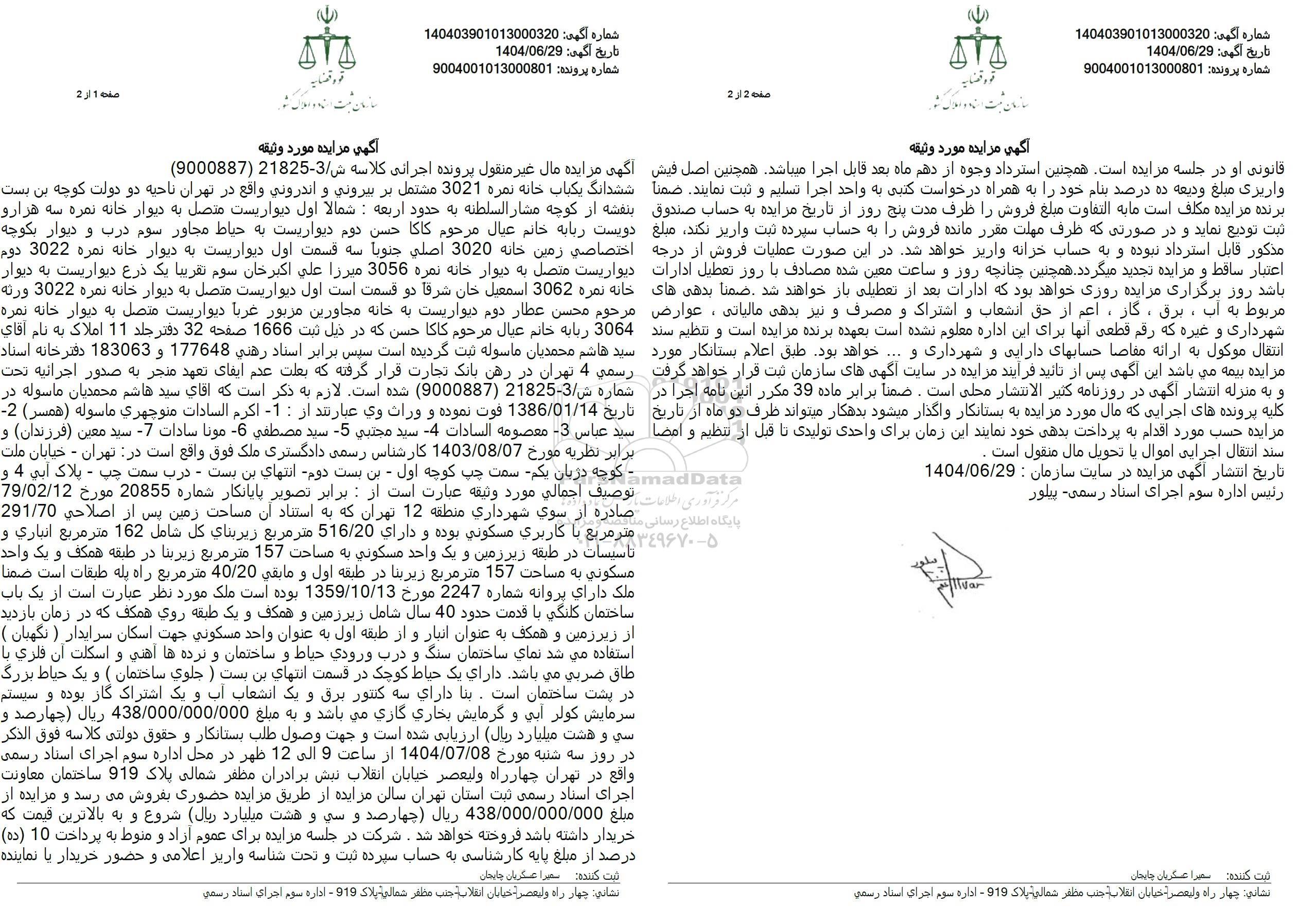 اگهی مزایده اموال غیر منقول / پرونده اجرائی کلاسه ش/ 3 - 21825 (9000887)