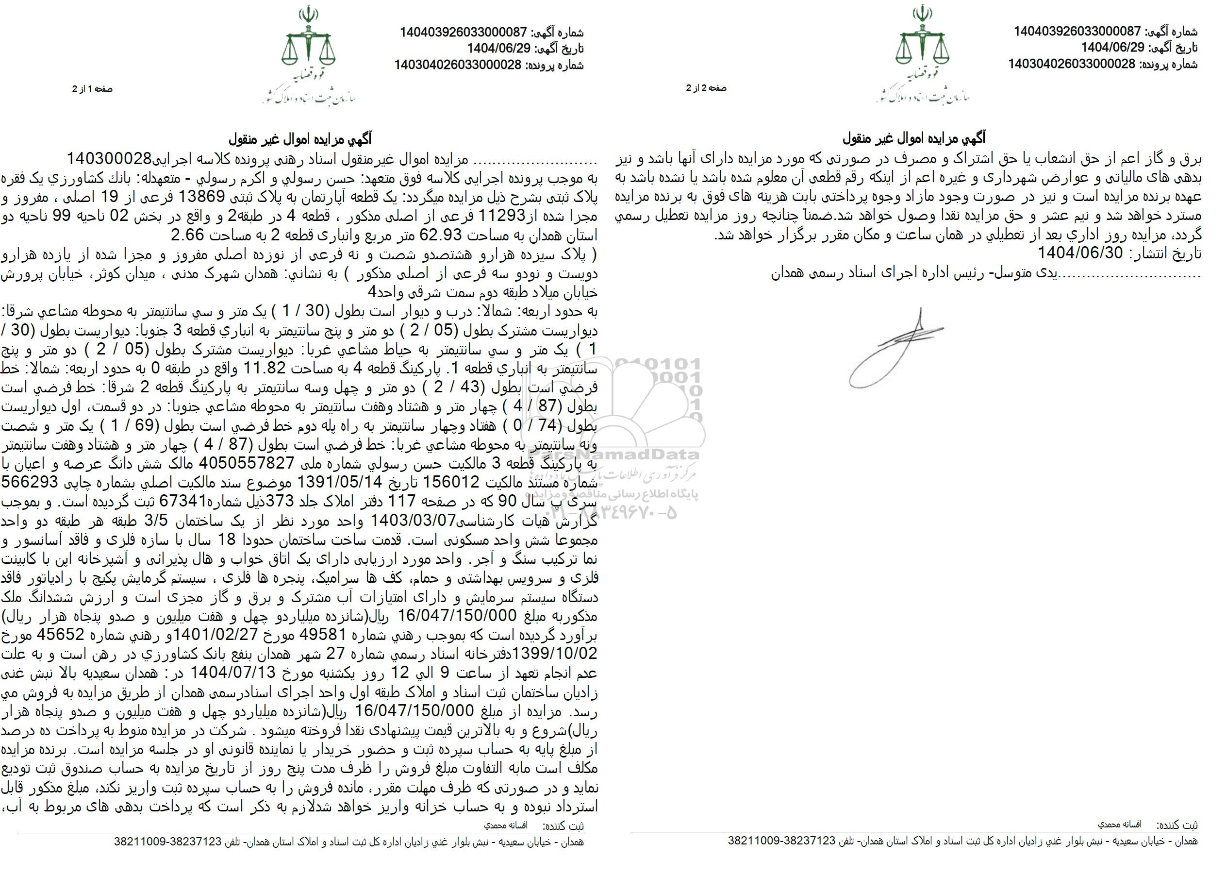 مزایده اموال غیر منقول استاد رهنی پرونده کلاسه اجرایی 140300028 به موجب پرونده اجرایی کلاسه فوق متعهد حسن رسولی و اکرم رسولي - متعهدله بانک کشاورزی یک فقره پلاک ثبتی بشرح ذیل مزایده میگردد یک قطعه آپارتمان به پلاک ثبتی 13869 فرعی از 19 اصلی، مفروز و مجزا شده از 11293 فرعی از اصلی مذکور، قطعه 4 در طبقه 2 و واقع در بخش 02 ناحيه 99 ناحیه دو استان همدان به مساحت 62.93 متر مربع و انباری قطعه 2 به مساحت 2.66 ) پلاک سپرده هزار و هشتصد و شصت و نه فرعی از نوزده اصلی مفروز و مجرا شده از یازده قرارو دویست و نودو سه فرعی از اصلی مذکور ( به نشانی همدان شهرک مدنی میدان کوثر خیابان پرورش خیابان میلاد طبقه دوم سمت شرقی واحد 4