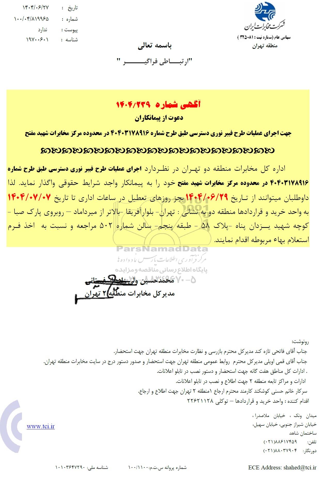 اداره کل مخابرات منطقه دو تهران در نظر دارداجرای عملیات طرح فیبر نوری دسترسی طبق طرح شماره 40403178916 در محدوده مرکز مخابرات شهید مفتح خود را به پیمانکار واجد شرایط حقوقی واگذار نماید لذا داوطلبان میتوانند از تاریخ 1404.06.29 بجز روزهای تعطیل در ساعات اداری تا تاریخ 1404.07.7 به واحد خرید و قراردادها منطقه دو به نشانی : تهران بلوار آفریقا بالاتر از میرداماد - روبروی پارک صبا کوچه شهید یزدان پناه - پلاک 58 - طبقه پنجم سالن شماره 502 مراجعه و نسبت به اخذ فرم استعلام بهاء مربوطه اقدام نمایند.