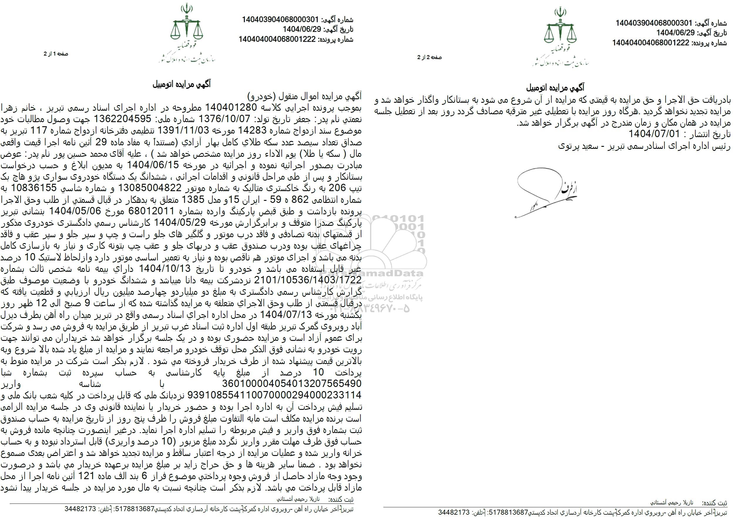 بموجب پرونده اجرایی کلاسه 140401280 مطروحه در اداره اجرای اسناد رسمی تبریز ، خانم زهرا نعمتی نام پدر جعفر تاریخ تولد: 1376.10.07 شماره ملی 1362204595 جهت وصول مطالبات خود موضوع سند ازدواج شماره 14283 مورخه 1391.11.03 تنظیمی دفترخانه ازدواج شماره 117 تبریز به صداق تعداد سیصد عدد سکه طلای کامل بهار آزادی (مستنداً به مفاد ماده 29 آئین نامه اجرا قیمت واقعی مال (سکه یا طلا) یوم الاداء روز مزایده مشخص خواهد شد) ، علیه آقای محمد حسین پور نام پدر عوض مبادرت بصدور اجرائیه نموده و اجرائیه در مورخه 1404.06.15 به مدیون ابلاغ و حسب درخواست بستانکار و پس از طی مراحل قانونی و اقدامات اجرائی ، ششدانگ یک دستگاه خودروی سواری پژو هاچ بک تیپ 206 به رنگ خاکستری متالیک به شماره موتور 13085004822 و شماره شاسی 10836155 به شماره انتظامی 862ه 59 - ایران 15 و مدل 1385 متعلق به بدهکار در قبال قسمتی از طلب وحق الاجرا پرونده بازداشت و طبق قبض پارکینگ وارده بشماره 68012011 مورخ 1404/05/06 بنشانی تبریز پارکینگ صدرا متوقف و برابرگزارش مورخه 1404.05.29 کارشناس رسمی دادگستری خودروی مذکور از قسمت های بدنه تصادفی و فاقد درب موتور و گلگیرهای جلو راست و چپ و سپر جلو و سپر عقب و فاقد چراغهای عقب بوده و درب صندوق عقب و درب های جلو و عقب چپ بتونه کاری و نیاز به بازسازی کامل بدنه میباشد و اجزای موتور هم ناقص بوده و نیاز به تعمیر اساسی موتور دارد و از لحاظ لاستیک 10 درصد غیر قابل استفاده میباشد و خودرو تا تاریخ 1404.10.13 دارای بیمه نامه شخص ثالث بشماره 2101/10536/1403/1722 نزد شرکت بیمه دانا میباشد و ششدانگ خودرو با وضعیت موصوف طبق گزارش کارشناس رسمی دادگستری به مبلغ دو میلیاردو چهارصد میلیون ریال ارزیابی و قطعیت یافته که در قبال قسمتی از طلب وحق الاجرای متعلقه به مزایده گذاشته شده که از ساعت 9 صبح الی 12 ظهر روز یکشنبه مورخه 1404.07.13 در محل اداره اجرای اسناد رسمی واقع در تبریز، میدان راه آهن ، بطرف دیزل آباد ، روبروی گمرک تبریز، طبقه اول، اداره ثبت اسناد غرب تبریز از طریق مزایده به فروش می رسد و شرکت برای عموم آزاد است و مزایده حضوری بوده و در یک جلسه برگزار خواهد شد. خریداران می توانند جهت رویت خودرو به نشانی فوق الذکر محل توقف خودرو مراجعه نمایند و مزایده از مبلغ یاد شده بالا شروع و به بالاترین قیمت پیشنهاد شده از طرف خریدار فروخته می شود . لازم بذکر است شرکت در مزایده منوط به پرداخت 10 درصد از مبلغ پایه کارشناسی به حساب سپرده ثبت بشماره شبا IR360100004054013207565490 یا شناسه واریز 939108554110070000294000233114 نزد بانک ملی که قابل پرداخت در کلیه شعب بانک ملی وتسلیم فیش پرداخت آن به اداره اجرا بوده و حضور خریدار یا نماینده قانونی وی در جلسه مزایده الزامیاست برنده مزایده مکلف است مابه التفاوت مبلغ فروش را ظرف پنج روز از تاریخ مزایده به حساب صندوقثبت بشماره فوق واریز و فیش مربوطه را تسلیم اداره اجرا نماید در غیر اینصورت چنانچه مانده فروش بهحساب فوق ظرف مهلت مقرر واریز نگردد مبلغ مزبور (10) درصد واریزی قابل استرداد نبوده و به حسابخزانه واریز شده و عملیات مزایده از درجه اعتبار ساقط و مزایده تجدید خواهد شد و اعتراض بعدی مسموع نخواهد بود. ضمنا سایر هزینه ها و حق حراج زاید بر مبلغ مزایده بر عهده خریدار می باشد و در صورتوجود وجه مازاد حاصل از فروش وجوه پرداختی موضوع فراز 6 بند الف ماده 121 آئین نامه اجرا از محل مازاد قابل پرداخت می باشد. لازم بذکر است چنانچه نسبت به مال مورد مزایده در جلسه خریدار پیدا نشود با دریافت حق الاجرا و حق مزایده به قیمتی که مزایده از آن شروع میشود به بستانکار واگذار خواهد شد و مزایده تجدید نخواهد گردید هرگاه روز مزایده با تعطیلی غیر مترقبه مصادف گردد روز بعد از تعطیل جلسه مزایده در همان مکان و زمان مندرج در آگهی برگزار خواهد شد.