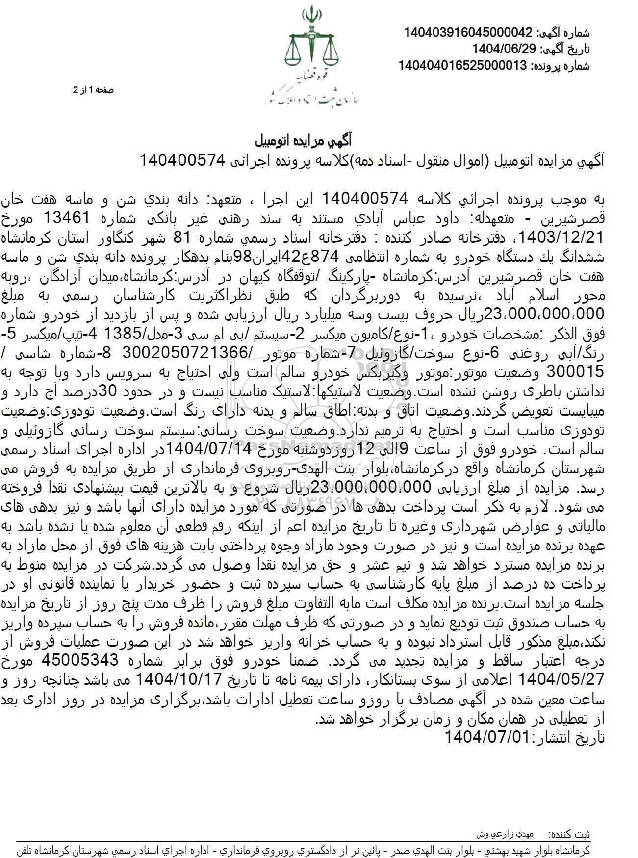 به موجب پرونده اجرائی كلاسه 140400574 این اجرا، متعهد دانه بندی شن و ماسه هفت خان قصر شیرین - متعهدله داود عباس آبادی مستند به سند رهنی غیر بانکی شماره 13461 مورخ 1403.12.21 ، دفترخانه صادر کننده : دفترخانه اسناد رسمی شماره 81 شهر کنگاور استان کرمانشاه ششدانگ یک دستگاه خودرو به شماره انتظامی 874 42 ایران 98 بنام بدهکار پرونده دانه بندی شن و ماسه هفت خان قصر شیرین آدرس کرمانشاه پارکینگ توقفگاه کیهان در آدرس کرمانشاه میدان آزادگان ، روبه محور اسلام آباد ، نرسیده به دور برگردان که طبق نظر اکثریت کارشناسان رسمی به مبلغ 23.000.000.000 ریال حروف بیست و سه میلیارد ریال ارزیابی شده و پس از بازدید از خودرو شماره فوق الذكر : مشخصات خودرو - 1 - نوع . کامیون میکسر -2 سیستم . بی ام سی -3- مدل 1385 4 - تیپ . میکسر -5 رنگ آبی روغنی -6- نوع سوخت گازوئیل -7 - شماره موتور 3002050721366 - شماره شاسی .300015 وضعیت موتور موتور و گیربکس خودرو سالم است ولی احتیاج به سرویس دارد و با توجه به نداشتن باطری روشن نشده است. وضعیت لاستیکها : لاستیک مناسب نیست و در حدود 30 درصد آج دارد و میبایست تعویض گردند وضعیت اتاق و بدنه اطاق سالم و بدنه دارای رنگ است وضعیت تودوزی: وضعیت تودوزی مناسب است و احتیاج به ترمیم ندارد وضعیت سوخت رسانی سیستم سوخت رسانی گازوئیلی و سالم است. خودرو فوق از ساعت 9 الی 12 روز دوشنبه مورخ 1404.07.14 در اداره اجرای اسناد رسمی شهرستان کرمانشاه واقع در کرمانشاه بلوار بنت الهدی - روبروی فرمانداری از طریق مزایده به فروش می رسد. مزایده از مبلغ ارزیابی 23.000.000.000 ریال شروع و به بالاترین قیمت پیشنهادی نقدا فروخته می شود. لازم به ذکر است پرداخت بدهی ها در صورتی که مورد مزایده دارای آنها باشد و نیز بدهی های مالیاتی و عوارض شهرداری و غیره تا تاریخ مزایده اعم از اینکه رقم قطعی آن معلوم شده یا نشده باشد به عهده برنده مزایده است و نیز در صورت وجود مازاد وجوه پرداختی بابت هزینه های فوق از محل مازاد به برنده مزایده مسترد خواهد شد و نیم عشر و حق مزایده نقدا وصول می گردد. شرکت در مزایده منوط به پرداخت ده درصد از مبلغ پایه کارشناسی به حساب سپرده ثبت و حضور خریدار یا نماینده قانونی او در جلسه مزایده است. برنده مزایده مکلف است ما به التفاوت مبلغ فروش را ظرف مدت پنج روز از تاریخ مزایده به حساب صندوق ثبت تودیع نماید و در صورتی که ظرف مهلت مقرر مانده فروش را به حساب سپرده واریز نکند ، مبلغ مذکور قابل استرداد نبوده و به حساب خزانه واریز خواهد شد در این صورت عملیات فروش از درجه اعتبار ساقط و مزایده تجدید میگردد. ضمنا خودرو فوق برابر شماره 45005343 مورخ 1404.05.27 اعلامی از سوی بستانکار دارای بیمه نامه تا تاریخ 1404.10.17 می باشد چنانچه روز و ساعت معین شده در آگهی مصادف با روز و ساعت تعطیل ادارات باشد برگزاری مزایده در روز اداری بعد از تعطیلی در همان مکان و زمان برگزار خواهد شد.