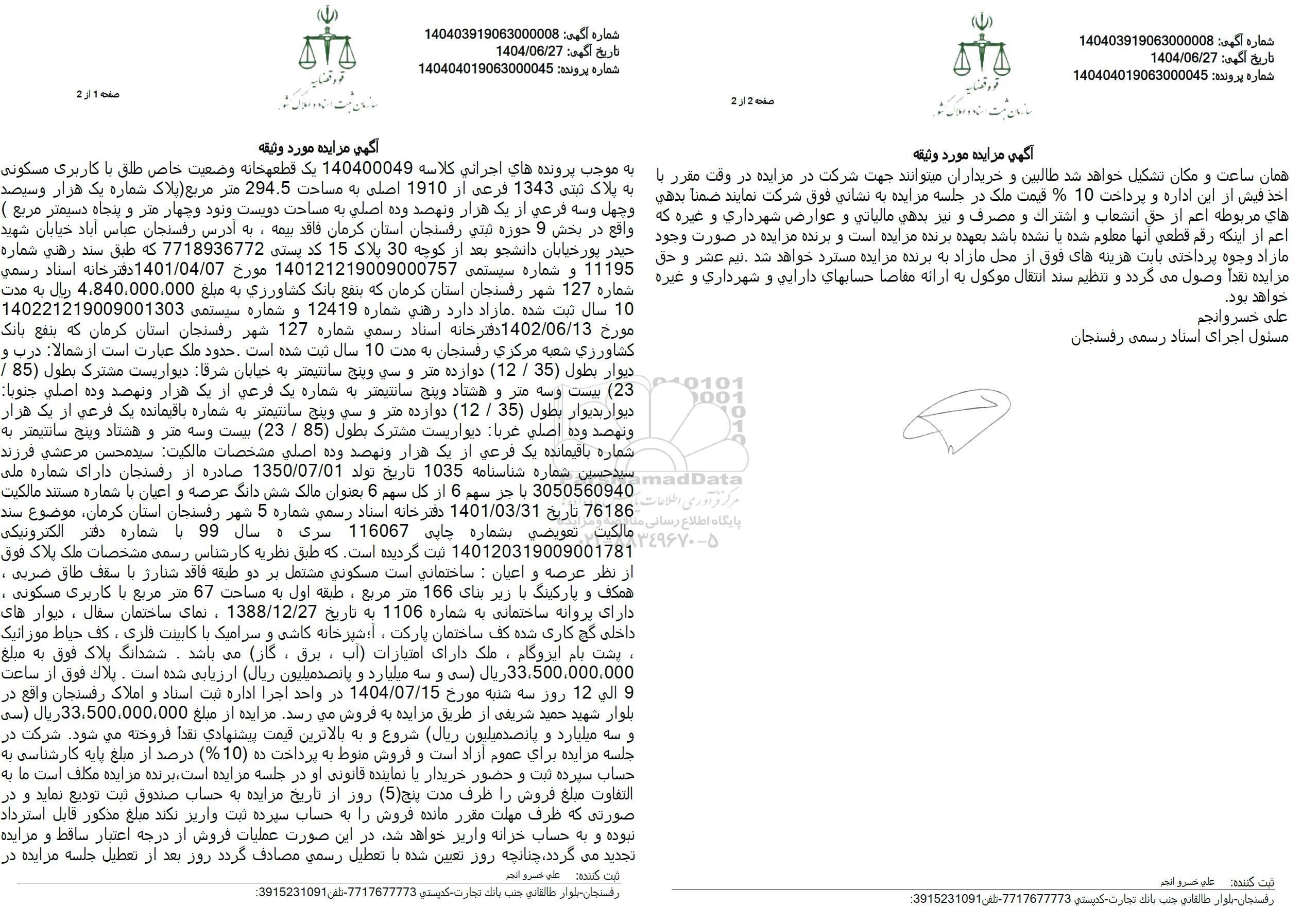 به موجب پرونده های اجرائی کلاسه 140400049 یک قطعه خانه وضعیت خاص طلق با کاربری مسکونی به پلاک ثبتی 1343 فرعی از 1910 اصلی به مساحت 294.5 متر مربع (پلاک شماره یک هزار و سیصد و چهل و سه فرعی از یک هزار و نهصد و ده اصلی به مساحت دویست و نود و چهار متر و پنجاه دسیمتر مربع) واقع در بخش 9 حوزه ثبتی رفسنجان، استان کرمان، فاقد بیمه ، به آدرس رفسنجان ،عباس آباد، خیابان شهید حیدر پور، خیابان دانشجو، بعد از کوچه 30 ، پلاک 15 ، کدپستی 7718936772 که طبق سند رهنی شماره 11195 و شماره سیستمی 140121219009000757 مورخ 1401.0.07 دفترخانه اسناد رسمی شماره 127 شهر رفسنجان، استان کرمان که بنفع بانک کشاورزی به مبلغ 4.840.000.000 ریال به مدت 10 سال ثبت شده مازاد دارد رهنی شماره 12419 و شماره سیستمى 140221219009001303 مورخ 1402.06.13 دفتر خانه اسناد رسمی شماره 127 شهر رفسنجان، استان کرمان که بنفع بانک کشاورزی شعبه مرکزی رفسنجان به مدت 10 سال ثبت شده است . حدود ملک عبارت است از شمالا درب و دیوار بطول (35) / (12) دوازده متر و سی و پنج سانتیمتر به خیابان شرقا دیواریست مشترک بطول 85 /(23) بیست و سه متر و هشتاد و پنج سانتیمتر به شماره یک فرعی از یک هزار و نهصد وده اصلی جنوبا دیوار بدیوار بطول (35) / 12 دوازده متر و سی و پنج سانتیمتر به شماره باقیمانده یک فرعی از یک هزار ونهصد وده اصلی غربا دیواریست مشترک بطول 85 / (23) بیست و سه متر و هشتاد و پنج سانتیمتر به شماره باقیمانده یک فرعی از یک هزار و نهصد وده اصلی مشخصات مالکیت سید محسن مرعشی فرزند سید حسین شماره شناسنامه 1035 تاریخ تولد 1350.07.01 صادره از رفسنجان دارای شماره ملی 3050560940 با جز سهم 6 از کل سهم 6 بعنوان مالک شش دانگ عرصه و اعیان با شماره مستند مالکیت 76186 تاریخ 1401.03.31 دفترخانه اسناد رسمی شماره 5 شهر رفسنجان استان کرمان موضوع سند مالکیت تعویضی بشماره چاپی 116067 سری ه سال 99 با شماره دفتر الکترونیکی 140120319009001781 ثبت گردیده است که طبق نظریه کارشناس رسمی مشخصات ملک پلاک فوق از نظر عرصه و اعیان: ساختمانی است مسکونی مشتمل بر دو طبقه فاقد شنارژ با سقف طاق ضربی ، همکف و پارکینگ با زیر بنای 166 متر مربع ، طبقه اول به مساحت 67 متر مربع با کاربری مسکونی ، دارای پروانه ساختمانی به شماره 1106 به تاریخ 1388.12.27 ، نمای ساختمان سفال ، دیوارهای داخلی گچ کاری شده کف ساختمان پارکت ، آشپزخانه کاشی و سرامیک با کابینت فلزی ، کف حیاط موزائیک ، پشت بام ایزوگام ، ملک دارای امتیازات آب ، برق ، گاز میباشد. ششدانگ پلاک فوق به مبلغ 35.50.00.000.000 ریال (سی و سه میلیارد و پانصد میلیون ریال) ارزیابی شده است. پلاک فوق از ساعت 9 الی 12 روز سه شنبه مورخ 1404.07.15 در واحد اجرا اداره ثبت اسناد و املاک رفسنجان واقع در بلوار شهید حمید شریفی از طریق مزایده به فروش میرسد مزایده از مبلغ 33.500.000.000 ریال (سی و سه میلیارد و پانصد میلیون ریال) شروع و به بالاترین قیمت پیشنهادی نقداً فروخته می شود. شرکت در جلسه مزایده برای عموم آزاد است و فروش منوط به پرداخت ده 10 درصد از مبلغ پایه کارشناسی به حساب سپرده ثبت و حضور خریدار یا نماینده قانونی او در جلسه مزایده است برنده مزایده مکلف است ما به التفاوت مبلغ فروش را ظرف مدت پنج (5) روز از تاریخ مزایده به حساب صندوق ثبت تودیع نماید و در صورتی که ظرف مهلت مقرر مانده فروش را به حساب سپرده ثبت واریز نکند مبلغ مذکور قابل استرداد نبوده و به حساب خزانه واریز خواهد شد در این صورت عملیات فروش از درجه اعتبار ساقط و مزایده تجدید میگردد، چنانچه روز تعیین شده با تعطیل رسمی مصادف گردد روز بعد از تعطیل جلسه مزایده در همان ساعت و مکان تشکیل خواهد شد طالبین و خریداران میتوانند جهت شرکت در مزایده در وقت مقرر با اخذ فیش از این اداره و پرداخت 10% قیمت ملک در جلسه مزایده به نشانی فوق شرکت نمایند . ضمناً بدهی های مربوطه اعم از حق انشعاب و اشتراک و مصرف و نیز بدهی مالیاتی و عوارض شهرداری و غیره که اعم از اینکه رقم قطعی آنها معلوم شده یا نشده باشد بعهده برنده مزایده است و برنده مزایده در صورت وجود مازاد وجوه پرداختی