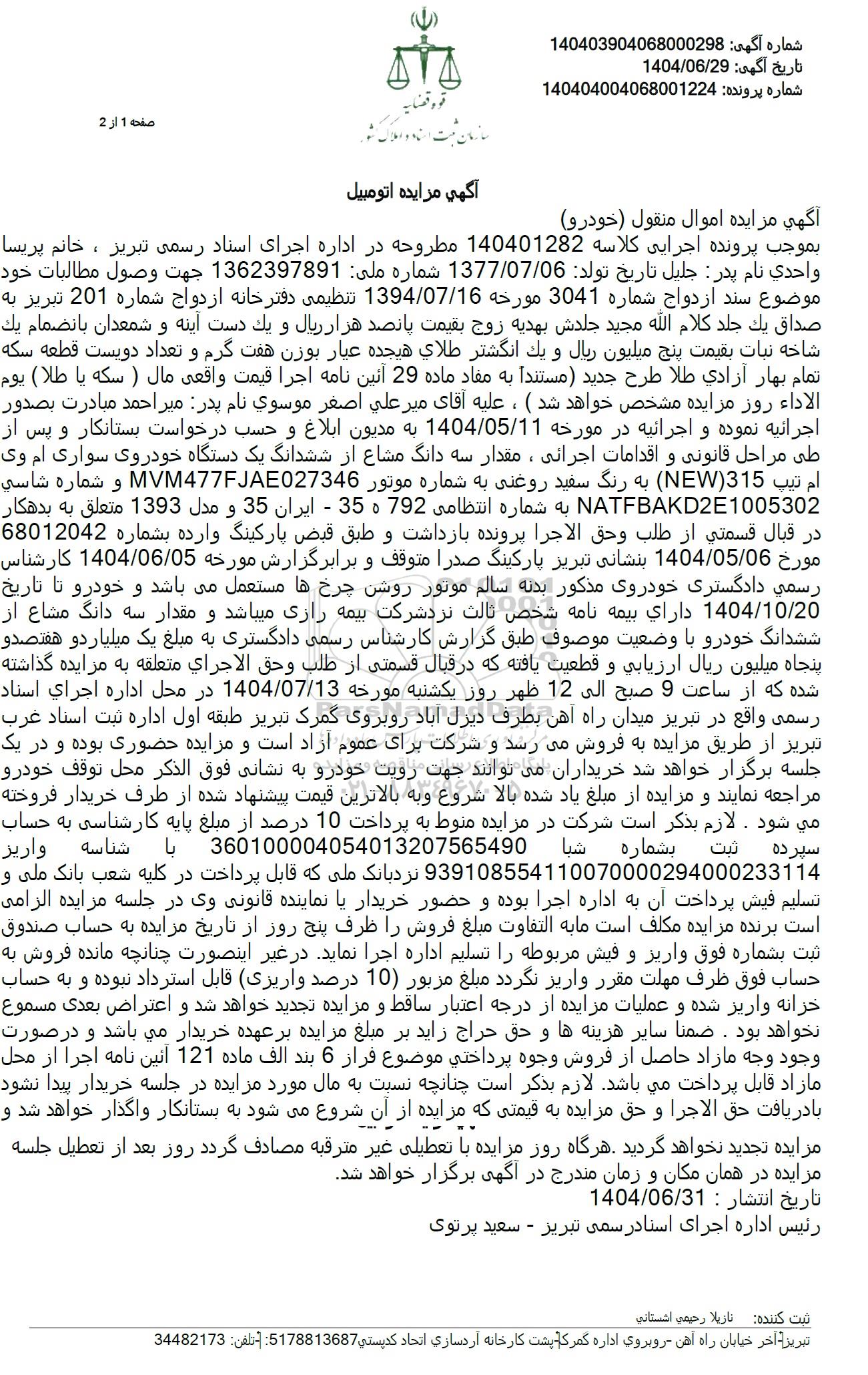 آگهی مزایده اموال منقول (خودرو) بموجب پرونده اجرایی کلاسه 140401282 مطروحه در اداره اجرای اسناد رسمی تبریز ، خانم پریسا واحدی نام پدر جلیل تاریخ تولد: 1377.07.06 شماره ملی 1362397891 جهت وصول مطالبات خود موضوع سند ازدواج شماره 3041 مورخه 1394.07.16 تنظیمی دفترخانه ازدواج شماره 201 تبریز به صداق یک جلد کلام الله مجید جلدش بهدیه زوج بقیمت پانصد هزار ریال و یک دست آینه و شمعدان بانضمام یک شاخه نبات بقیمت پنج میلیون ریال و یک انگشتر طلای هیجده عیار بوزن هفت گرم و تعداد دویست قطعه سکه تمام بهار آزادی طلا طرح جدید مستندا به مفاد ماده 29 آئین نامه اجرا قیمت واقعی مال (سکه یا طلا) یوم الاداء روز مزایده مشخص خواهد شد ، علیه آقای میر علی اصغر موسوی نام پدر میراحمد مبادرت بصدور اجرائیه نموده و اجرائیه در مورخه 1404.05.11 به مدیون ابلاغ و حسب درخواست بستانکار و پس از طی مراحل قانونی و اقدامات اجرائی ، مقدار سه دانگ مشاع از ششدانگ یک دستگاه خودروی سواری ام وی ام تیپ 315 (NEW) به رنگ سفید روغنی به شماره موتور MVM477FJAE027346 و شماره شاسی NATFBAKD2E1005302 به شماره انتظامی 792 ه 35 - ایران 35 و مدل 1393 متعلق به بدهکار سپرده در قبال قسمتی از طلب وحق الاجرا پرونده بازداشت و طبق قبض پارکینگ وارده بشماره 68012042 مورخ 1404.05.06 بنشانی تبریز پارکینگ صدرا متوقف و برابرگزارش مورخه 1404.06.05 کارشناس رسمی دادگستری خودروی مذکور بدنه سالم موتور روشن چرخها مستعمل میباشد و خودرو تا تاریخ 1404.10.20 دارای بیمه نامه شخص ثالث نزد شرکت بیمه رازی میباشد و مقدار سه دانگ مشاع از ششدانگ خودرو با وضعیت موصوف طبق گزارش کارشناس رسمی دادگستری به مبلغ یک میلیارد و هفت صد و پنجاه میلیون ریال ارزیابی و قطعیت یافته که در قبال قسمتی از طلب وحق الاجرای متعلقه به مزایده گذاشته شده که از ساعت 9 صبح الى 12 ظهر روز یکشنبه مورخه 1404.07.13 در محل اداره اجرای اسناد رسمی واقع در تبریز، میدان راه آهن، بطرف دیزل آباد ، روبروی گمرک تبریز، طبقه اول، اداره ثبت اسناد غرب تبریز از طریق مزایده به فروش میرسد و شرکت برای عموم آزاد است و مزایده حضوری بوده و در یک جلسه برگزار خواهد شد. خریداران میتوانند جهت رویت خودرو به نشانی فوق الذکر محل توقف خودرو مراجعه نمایند و مزایده از مبلغ یاد شده بالا شروع و به بالاترین قیمت پیشنهاد شده از طرف خریدار فروخته می شود . لازم بذکر است شرکت در مزایده منوط به پرداخت 10 درصد از مبلغ پایه کارشناسی به حساب ثبت بشماره شبا 360100004054013207565490 با شناسه واریز 939108554110070000294000233114 نردبانک ملی که قابل پرداخت در کلیه شعب بانک ملی و تسلیم فیش پرداخت آن به اداره اجرا بوده و حضور خریدار یا نماینده قانونی وی در جلسه مزایده الرامی است برنده مزایده مکلف است ما به التفاوت مبلغ فروش را ظرف پنج روز از تاریخ مزایده به حساب صندوق ثبت بشماره فوق واریز و فیش مربوطه را تسلیم اداره اجرا نماید . در غیر اینصورت چنانچه مانده فروش به حساب فوق ظرف مهلت مقرر واریز نگردد مبلغ مزبور (10) درصد واریزی قابل استرداد نبوده و به حساب خزانه واریز شده و عملیات مزایده از درجه اعتبار ساقط و مزایده تجدید خواهد شد و اعتراض بعدی مسموع نخواهد بود . ضمنا سایر هزینه ها و حق حراج زاید بر مبلغ مزایده بر عهده خریدار می باشد و در صورت وجود وجه مازاد حاصل از فروش وجوه پرداختی موضوع فراز 6 بند الف ماده 121 آئین نامه اجرا از محل مازاد قابل پرداخت میباشد. لازم بذکر است چنانچه نسبت به مال مورد مزایده در جلسه خریدار پیدا نشود با دریافت حق الاجرا و حق مزایده به قیمتی که مزایده از آن شروع میشود به بستانکار واگذار خواهد شد و مزایده تجدید نخواهد گردید. هرگاه روز مزایده با تعطیلی غیر مترقبه مصادف گردد روز بعد از تعطیل جلسهمزایده در همان مکان و زمان مندرج در آگهی برگزار خواهد شد.