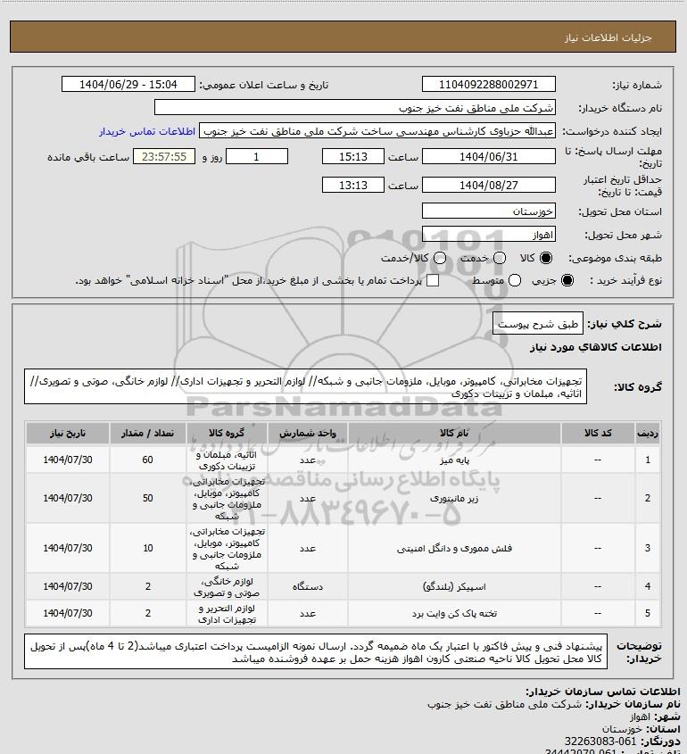 | 2 | -- | زیر مانیتوری | عدد | تجهیزات مخابراتی، کامپیوتر، موبایل، ملزومات جانبی و شبکه | 50 | 1404/07/30 |