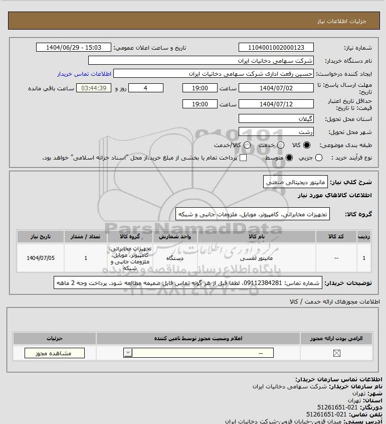 | 1 | -- | مانیتور لمسی | دستگاه | تجهیزات مخابراتی، کامپیوتر، موبایل، ملزومات جانبی و شبکه | 1 | 1404/07/05 |
