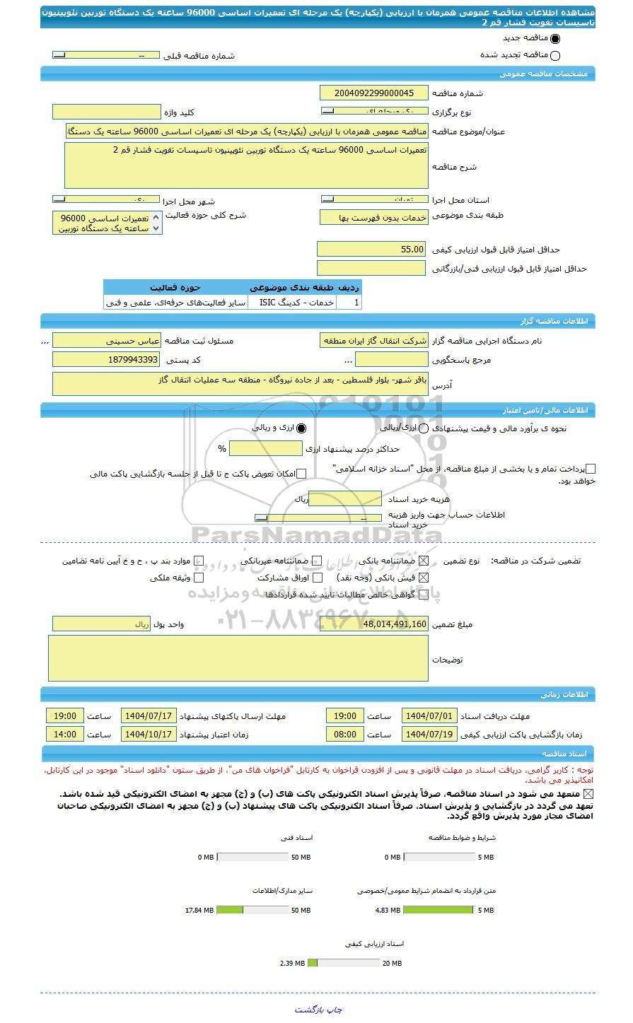 حداقل امتیاز قابل قبول ارزیابی کیفی55.00حداقل امتیاز قابل قبول ارزیابی فنی/بازرگانی